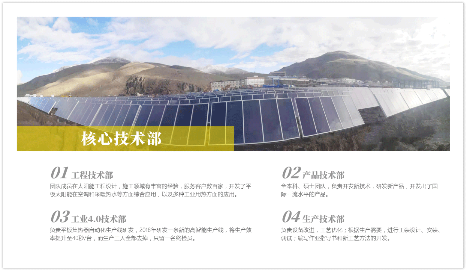 公司拥有行业内优秀骨干人才,积极整合高校、科研院所技术资源,拥有认定企业技术中心,拥有行业先进的研发、测试技术装备平台。集团公司拥有4个技术部、1个研究院、1个实验室,为材料、产品、设备、系统、应用研发打下了坚实的基础。公司拥有完善的质量管理体系,先后通过了ISO9001、ISO14001、OHSAS18001及国家强制性产品认证等一系列认证,通过欧盟Solar Key-mark国际产品认证。