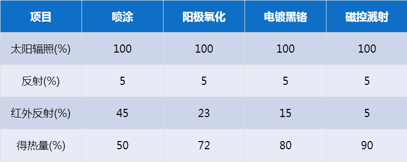 其中喷涂工艺方法制备的涂层基本上没有选择性,这意味着太阳光谱的吸收比和红外波段的发射比接近甚至相等。造成涂层对太阳光谱波段(0.3μm~2.5μm)和红外波段(2.5μm~25μm)都是透明的、都是吸收的,会出现太阳光谱内吸热也能通过红外辐射散热。阳极氧化和电镀黑铬具有一定的选择性,红外发射较高。磁控溅射蓝膜具有高选择性,具有很大的能效比α/ε。